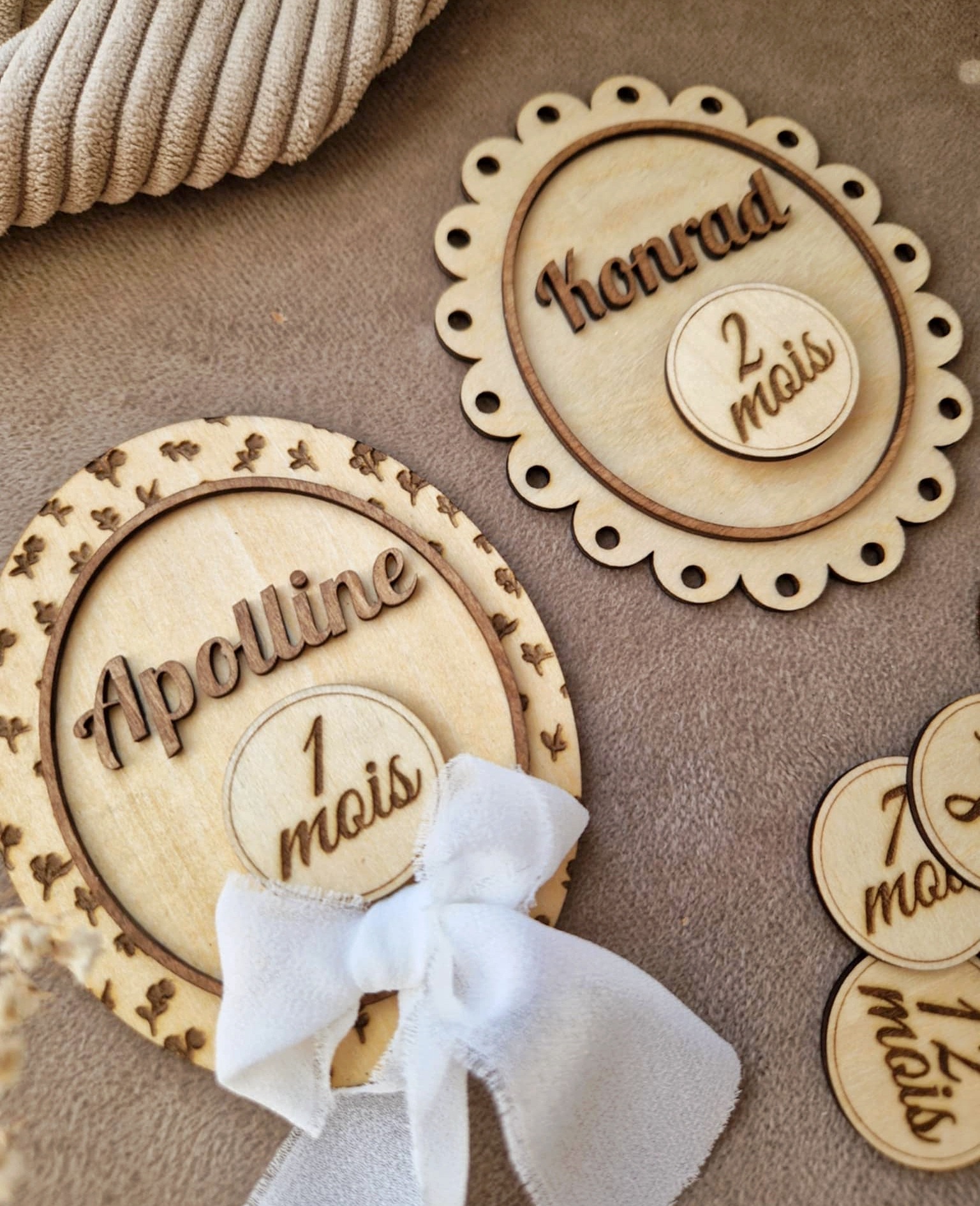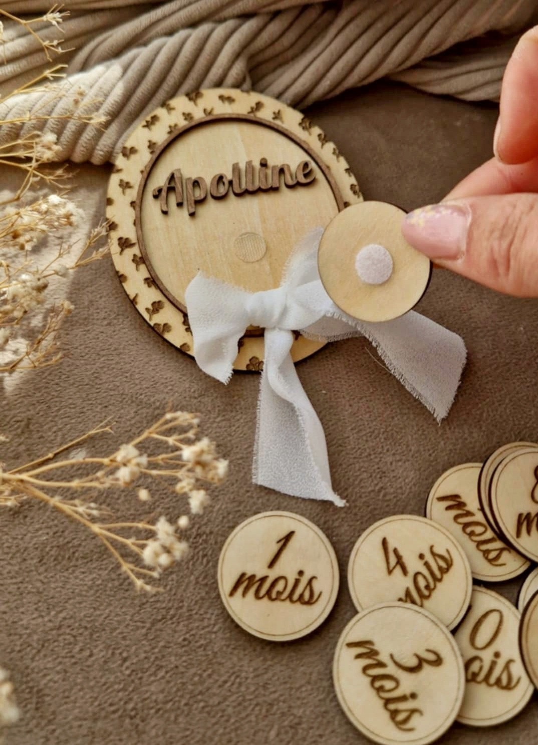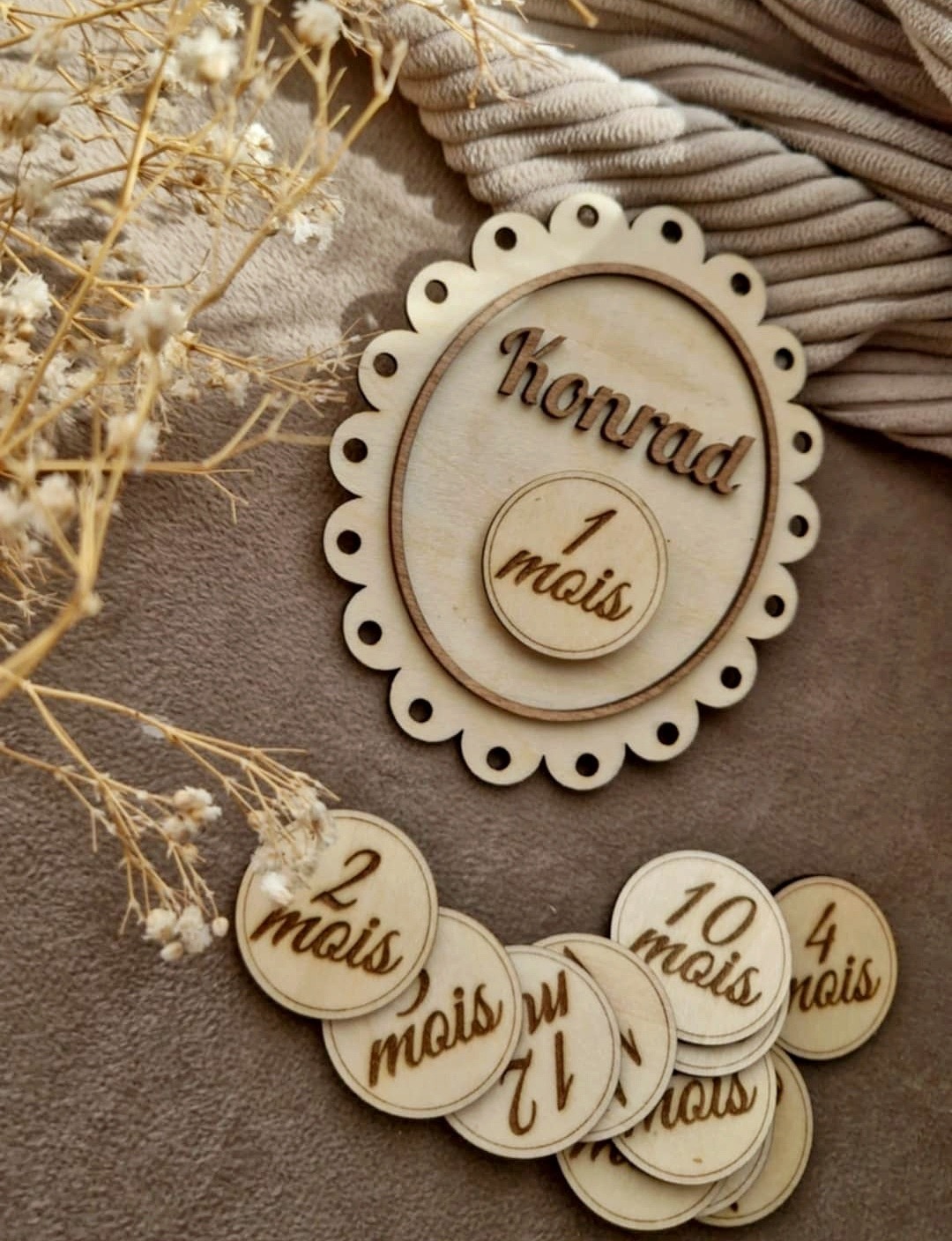 • 12 petits disques interchangeables, gravés de 1 à 12 mois. (Avec scratch)