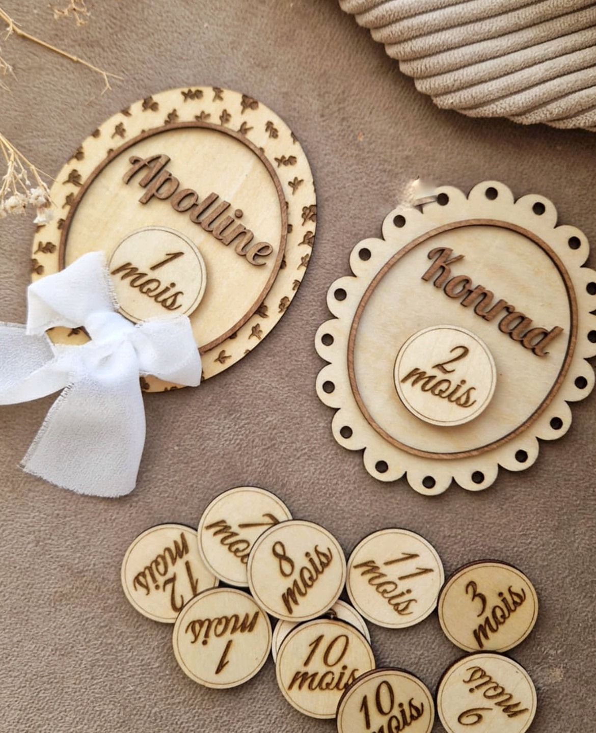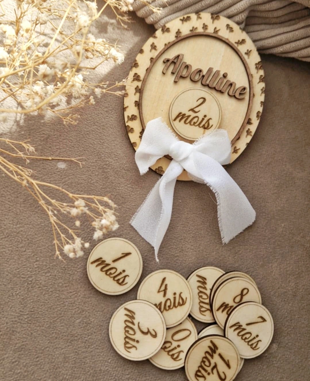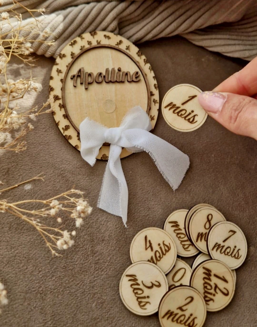• 12 petits disques interchangeables, gravés de 1 à 12 mois. (Avec scratch)