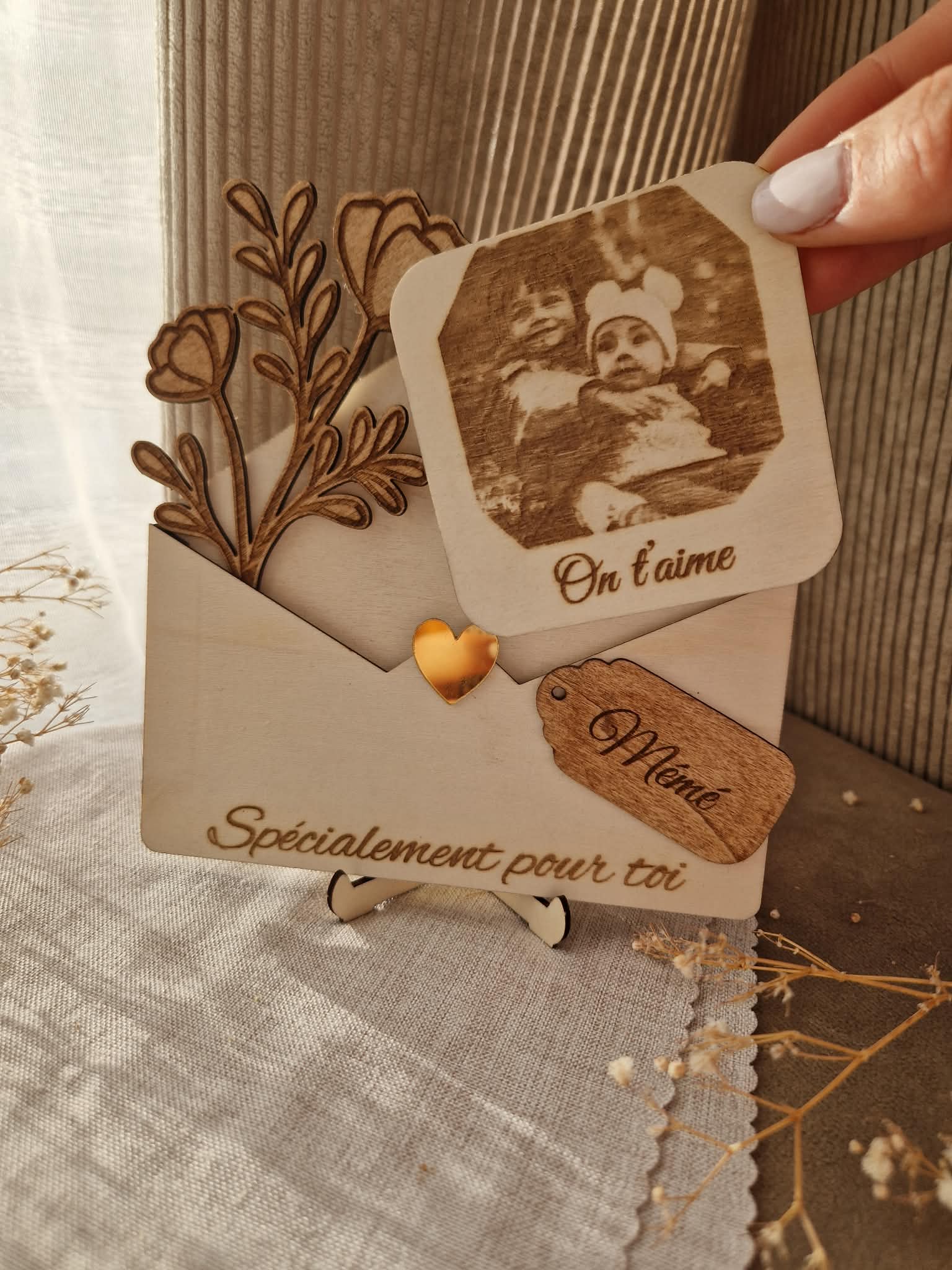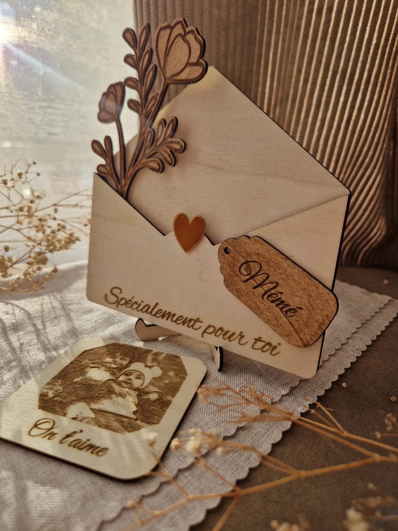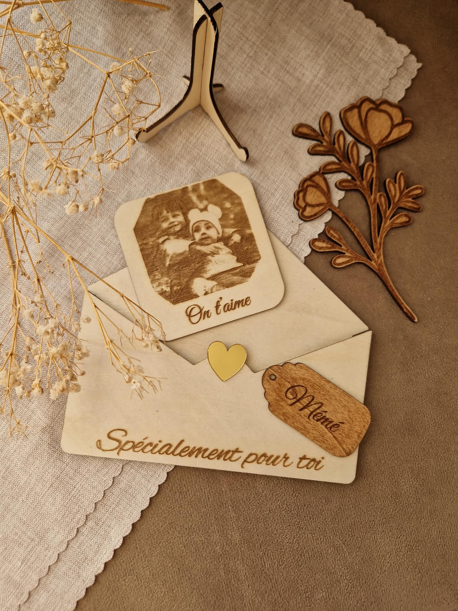 Offrez un souvenir unique et plein d’émotion avec cette enveloppe décorative en bois, entièrement personnalisable.