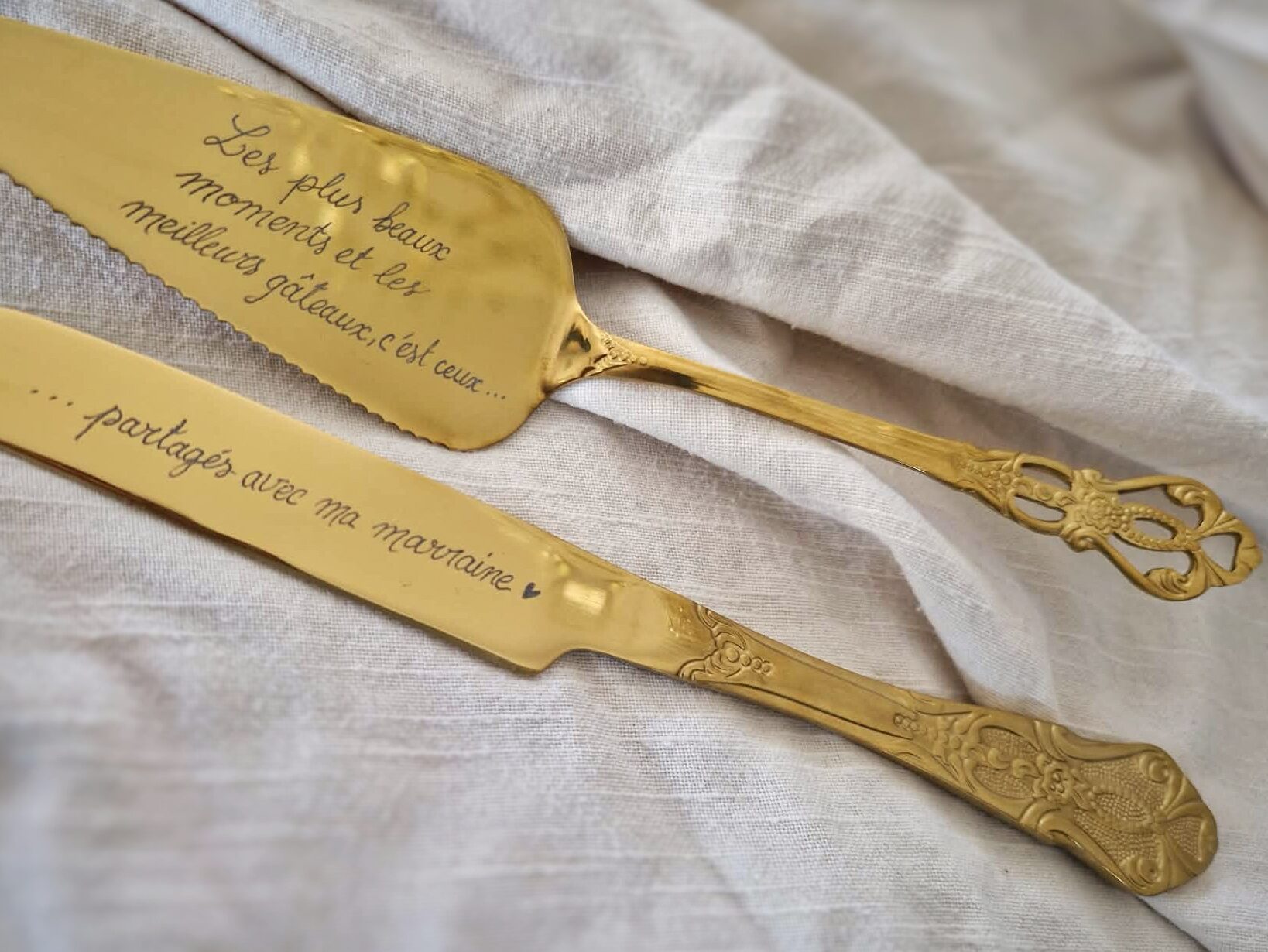 Sublimez vos moments gourmands avec ce magnifique set composé d’une pelle à tarte et d’un couteau dorés, finement gravés pour ajouter une touche raffinée à vos instants de partage.