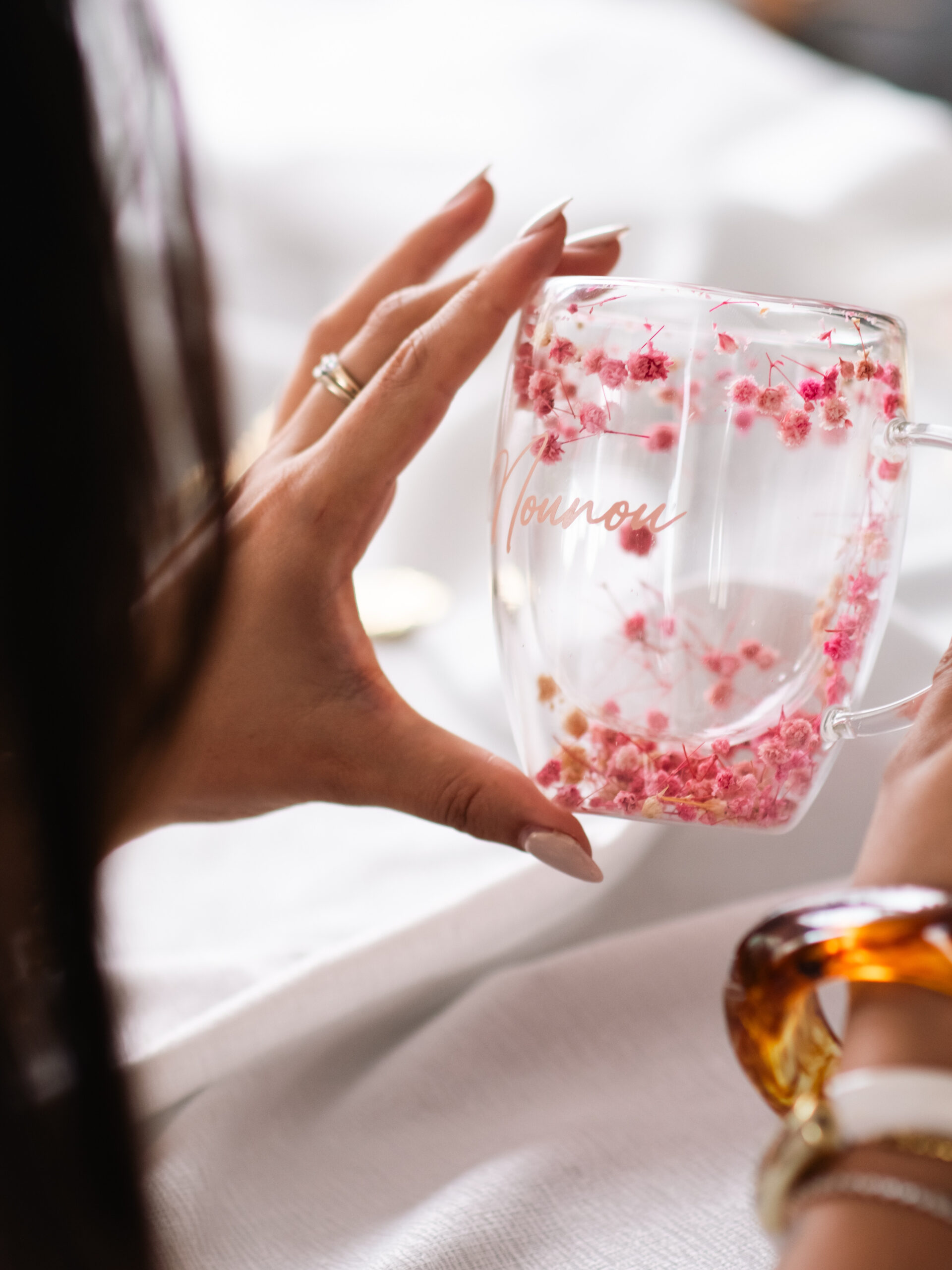 Offrez un cadeau plein de douceur et d’élégance avec cette magnifique tasse en double parois, ornée de fleurs séchées. 🌸